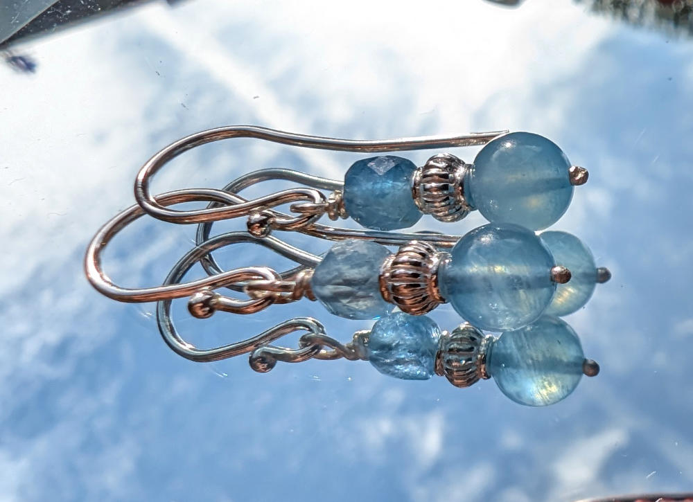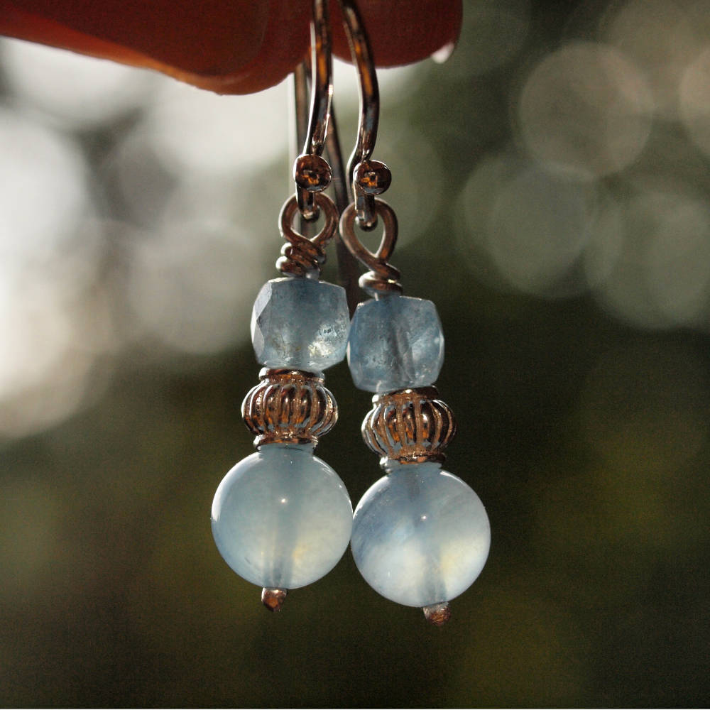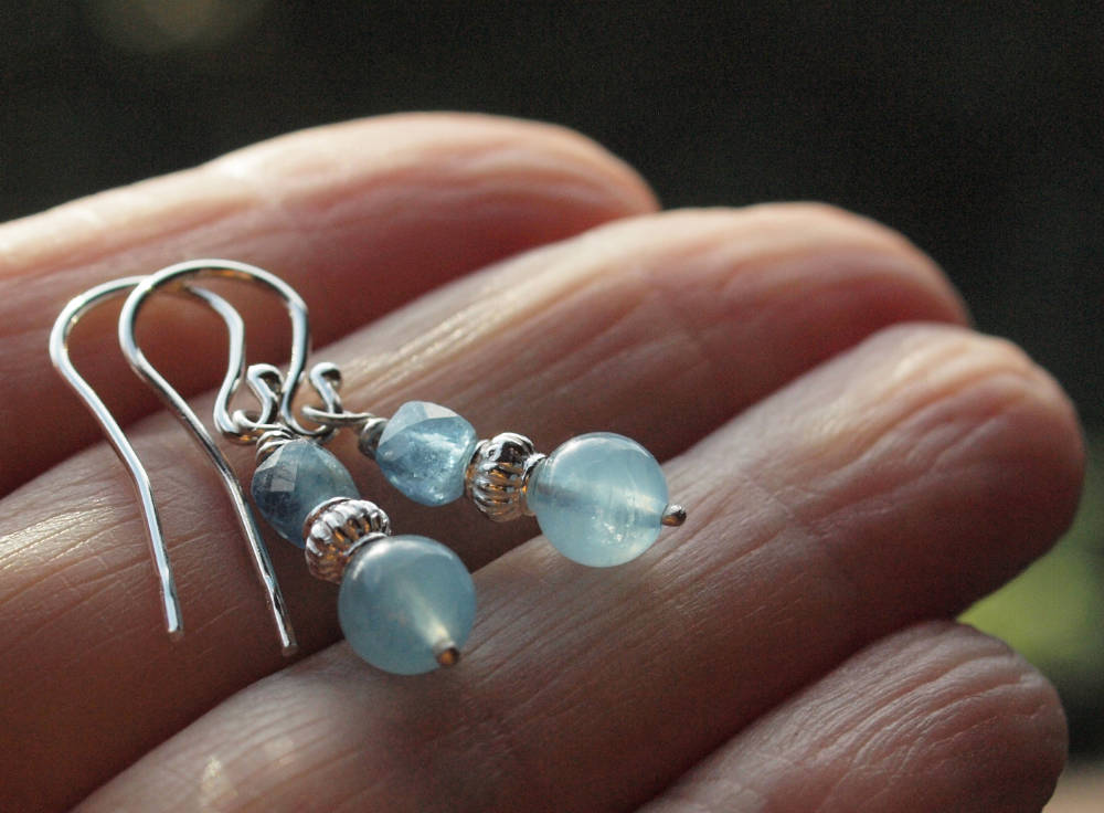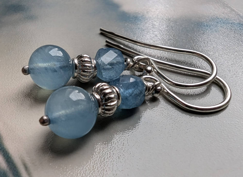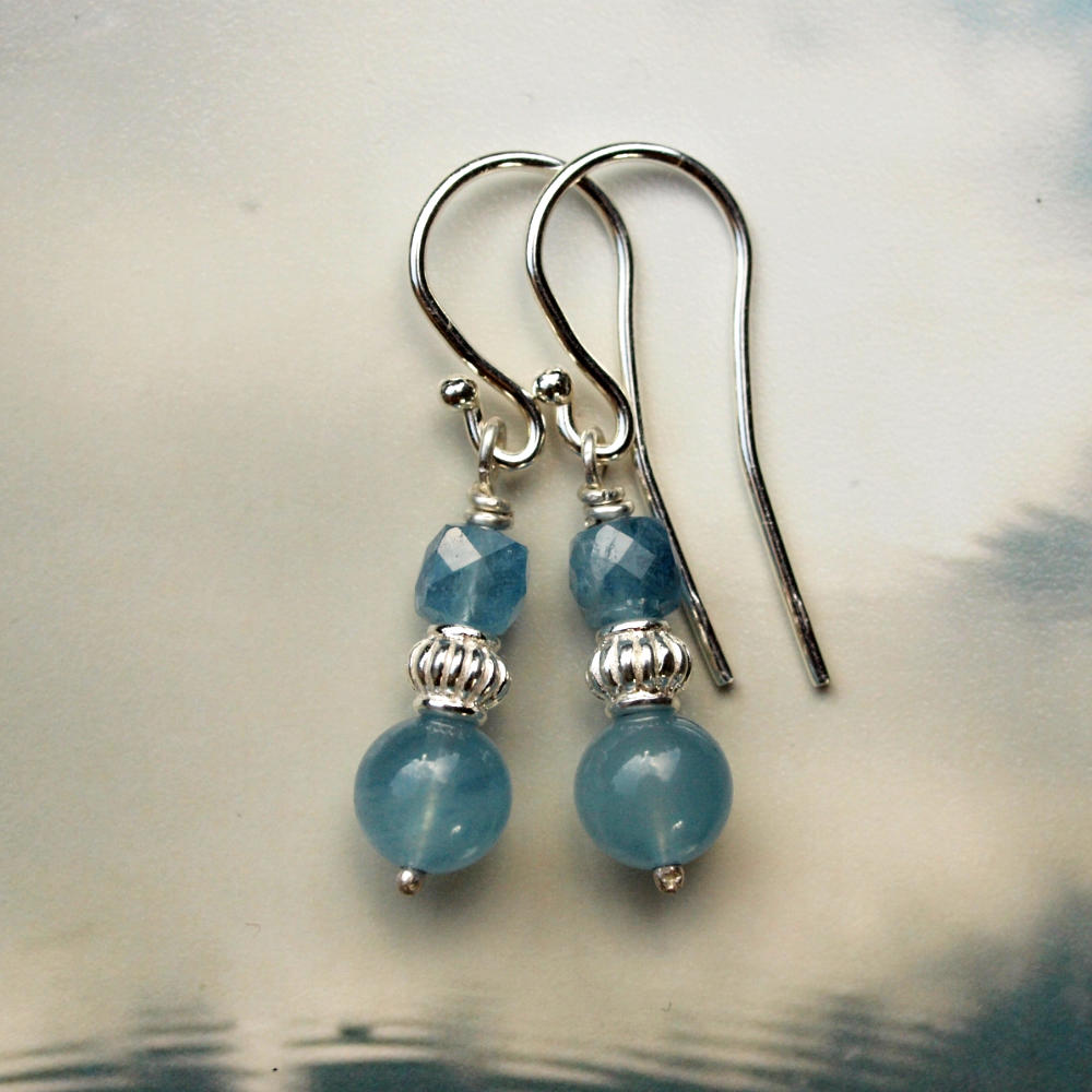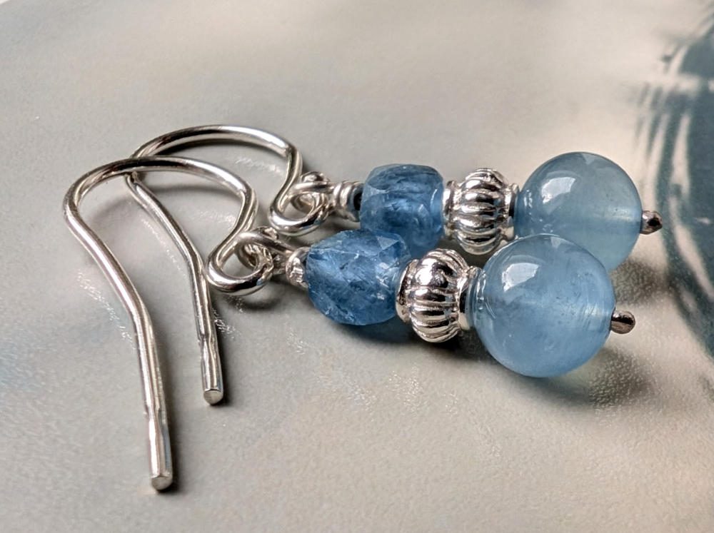 Intensiv blaue Ohrringe aus Aquamarin Kugeln und facettierten Aquamarin Würfeln mit geriffelten Silber Linsen und Silberohrhaken.