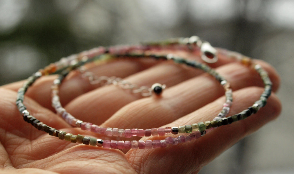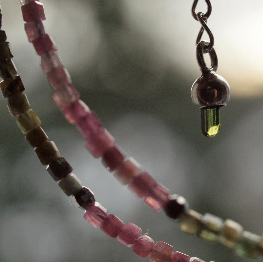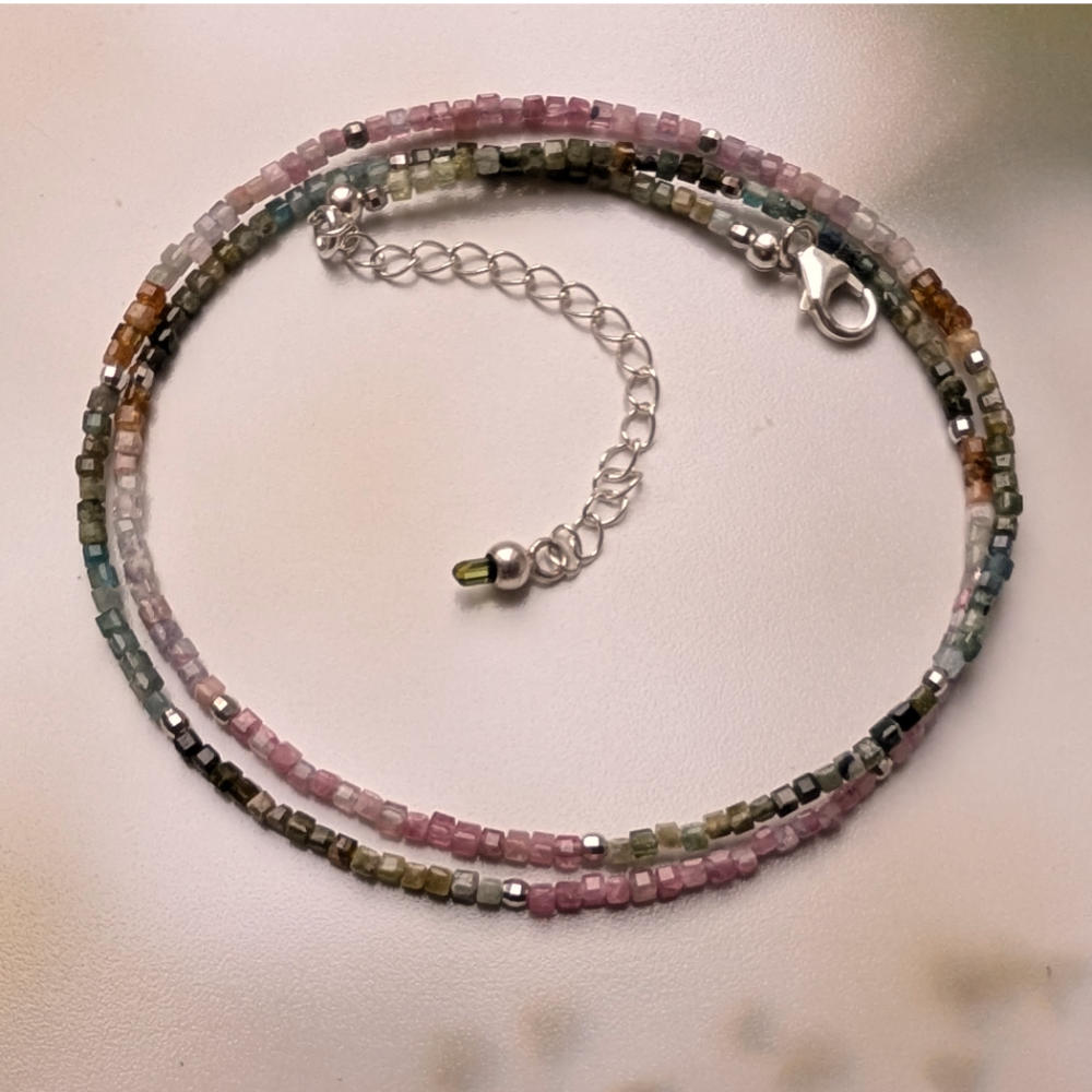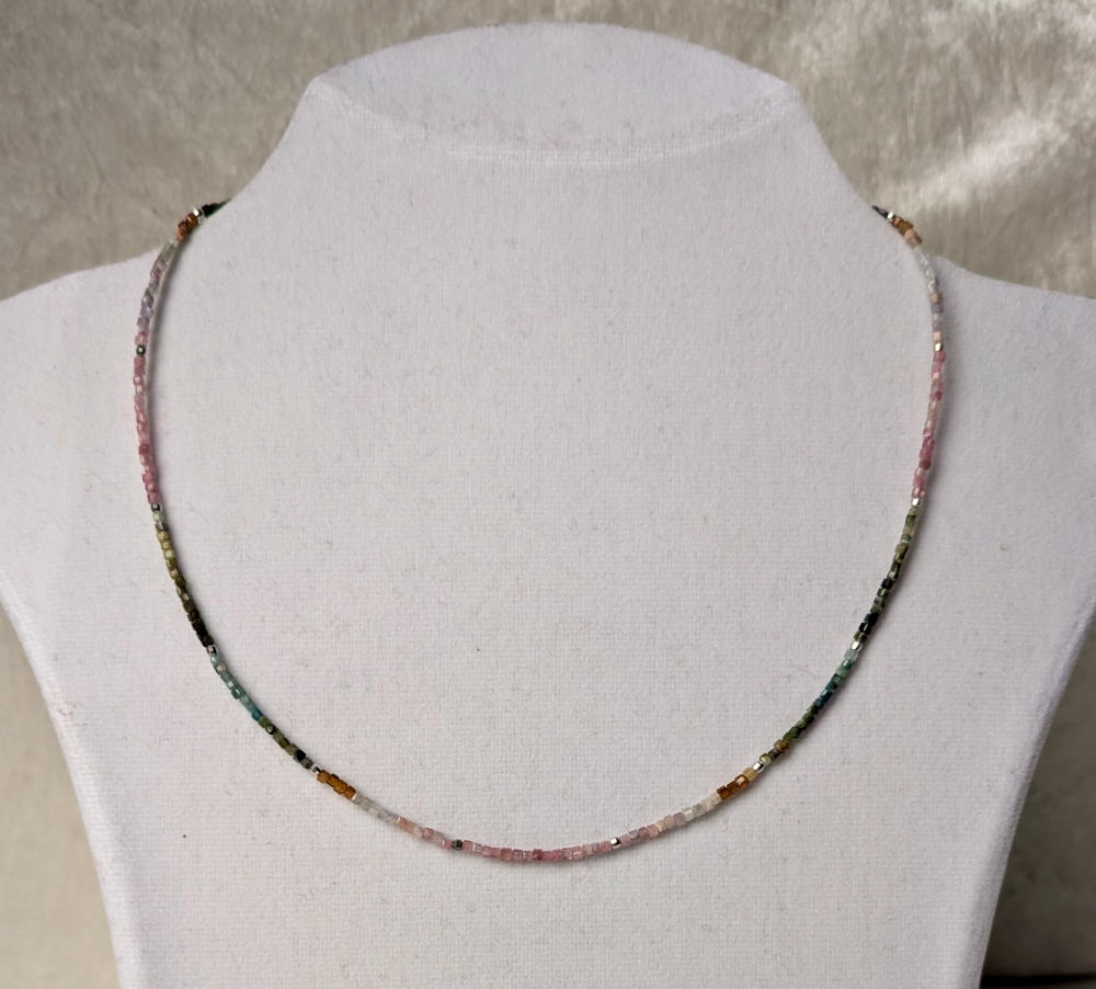 Die zarte Kette mit kleinen mehrfarbigen Turmalin Würfeln hilft dir mit offenem Herzen auf Menschen und Situationen zuzugehen.