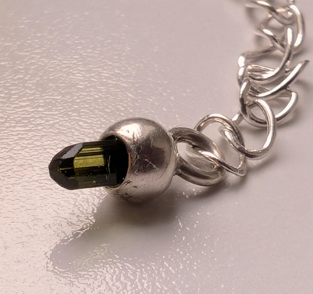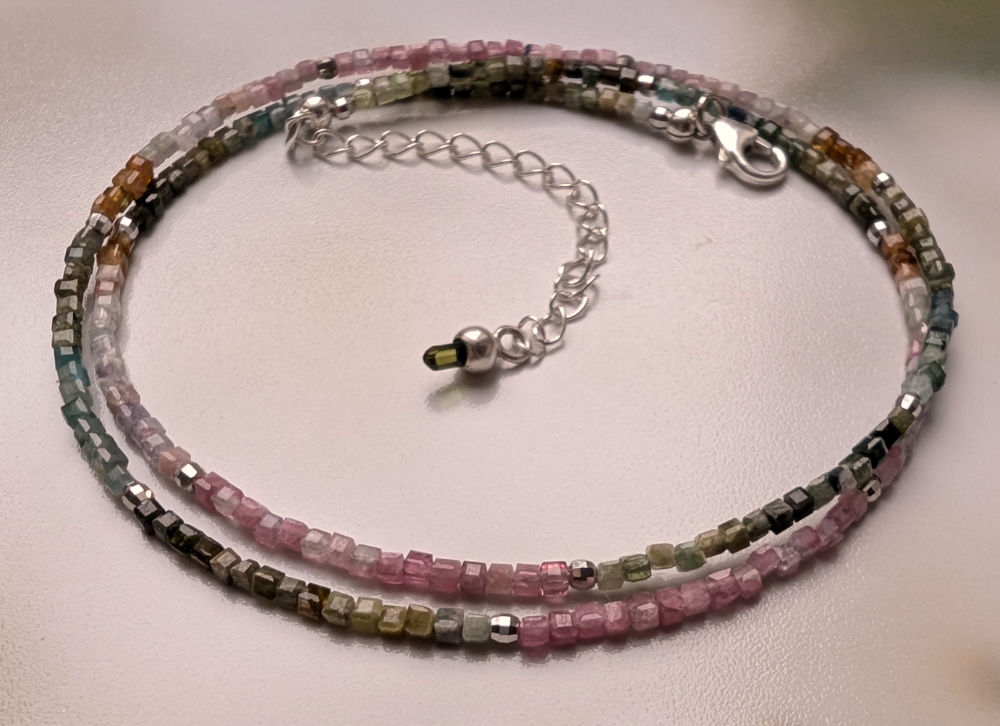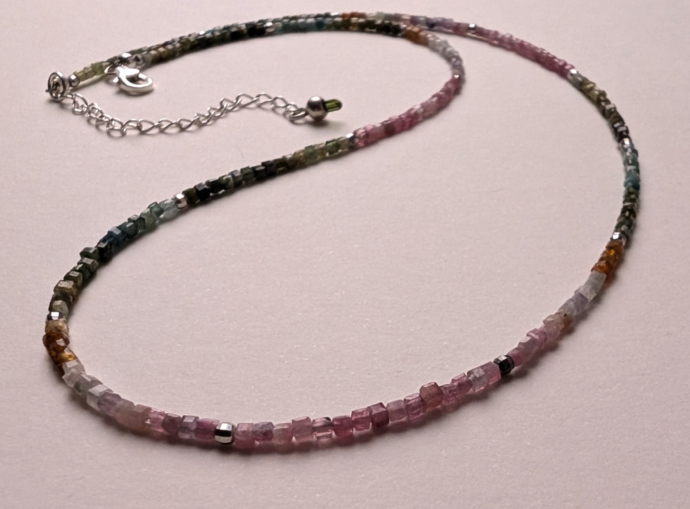 Diese zierliche Edelsteinkette besteht aus kleinen facettierten bunten Turmalin Würfeln, dazwischen habe ich kleine rhodinierte Silber Kugeln gesetzt mit Silber. Die Kette hat einen Silber Karabiner Verschluss und ein Silber Verlängerungskettchen mit einem Mini Verdelith (grüner Turmalin) Kristall Anhänger.