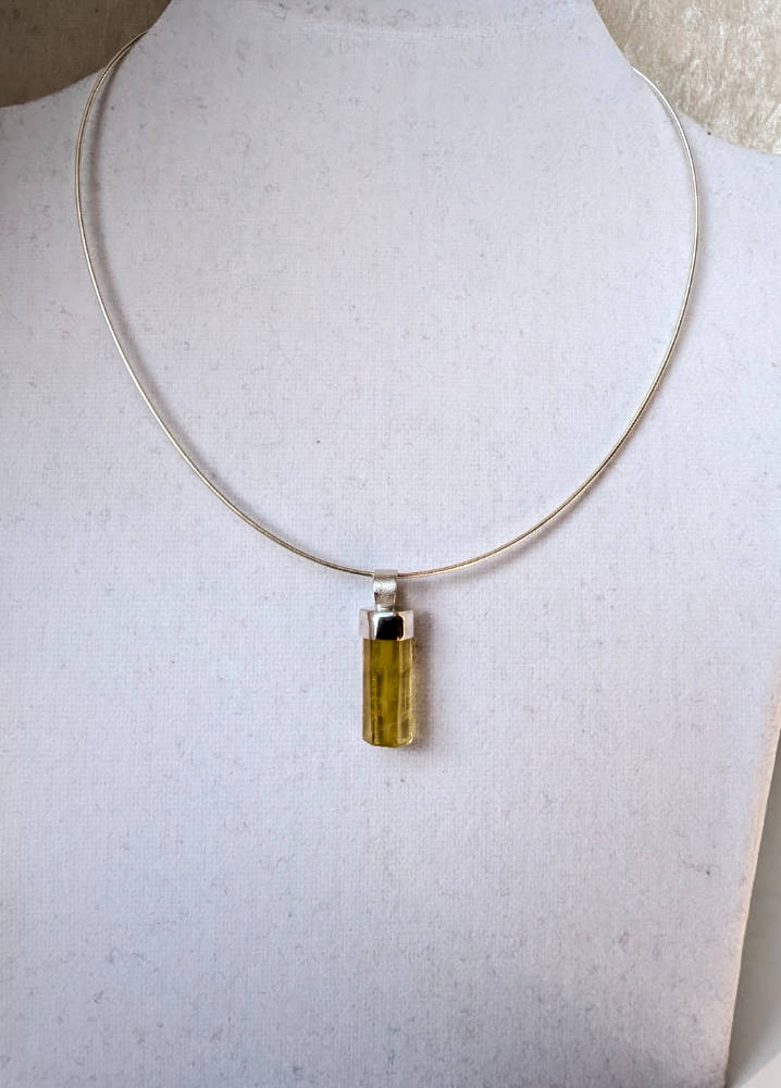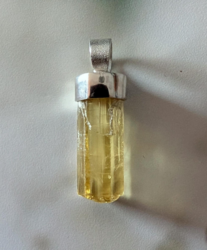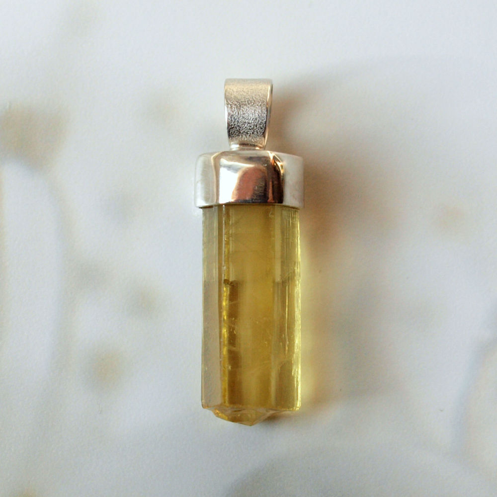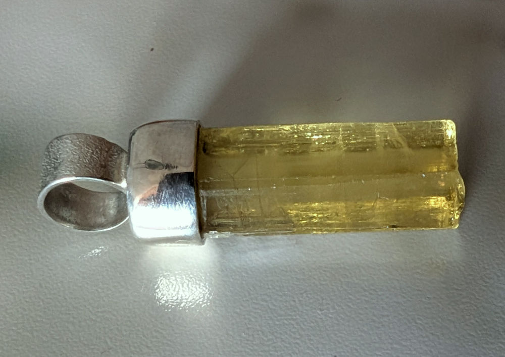 Anhänger aus einem klaren goldgelben Heliodor – Goldberyll Kristall mit kräftiger gelber Farbe und in guter Qualität, den ich in Silber gefasst habe.