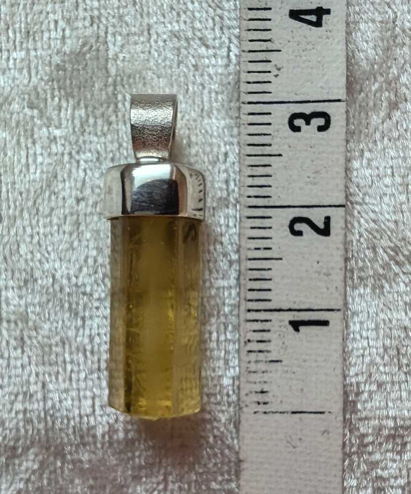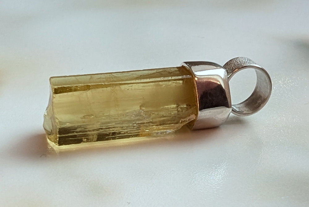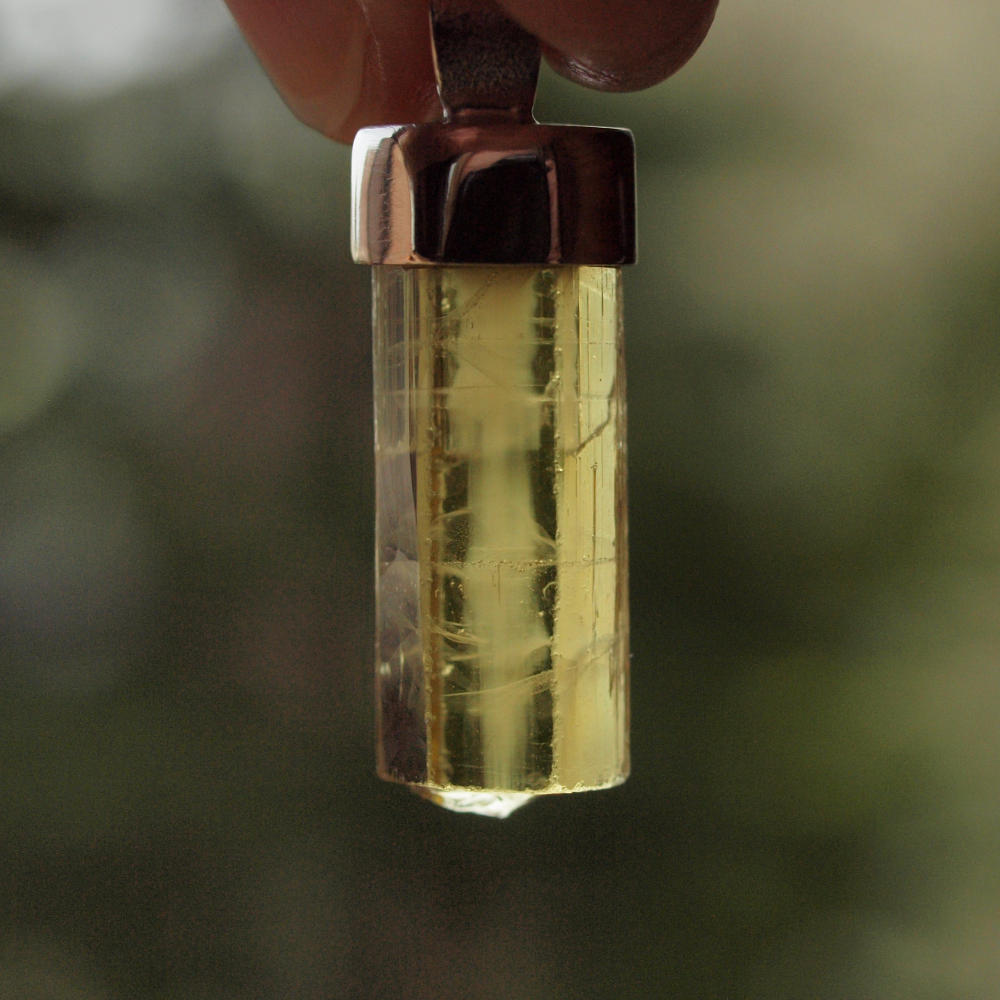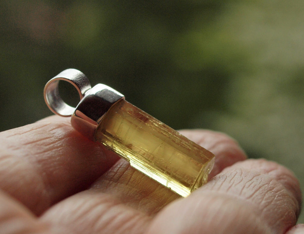 Anhänger aus einem klaren goldgelben Heliodor – Goldberyll Kristall mit kräftiger gelber Farbe und in guter Qualität, den ich in Silber gefasst habe.