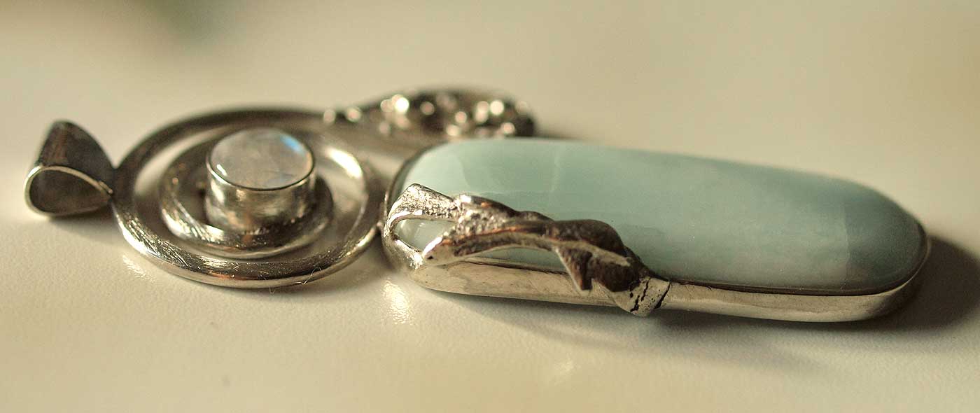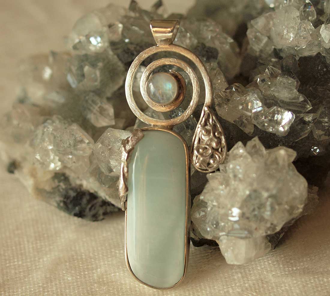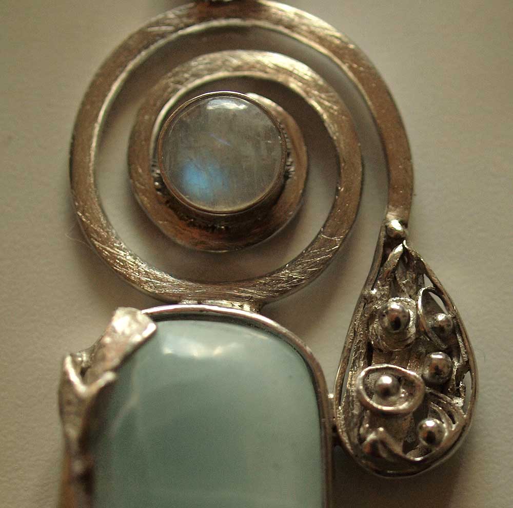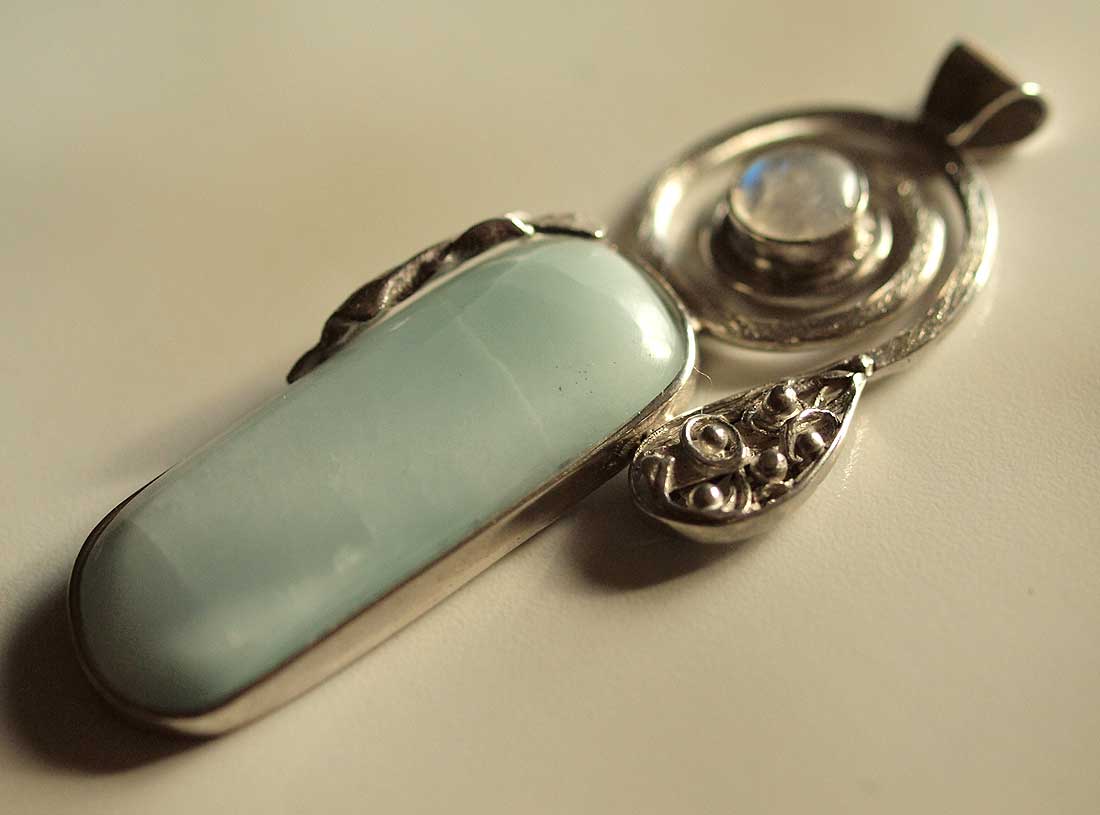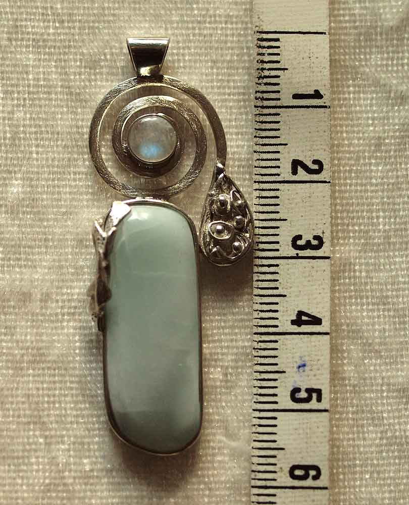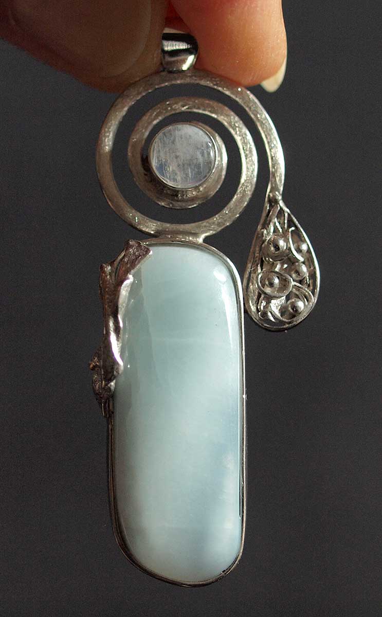 Ganz besonderer Anhänger aus einem länglichen Larimar Cabochon und einem blauschimmernden Mondstein Cabochon in Silber gefasst mit einer Silberspirale und Verzierungen.