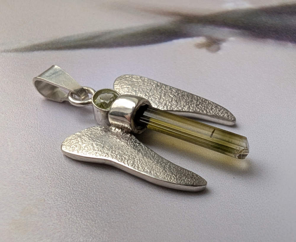Handgefertigter Mini-Engel aus einem facettierten Peridot und einem olivgrünen Turmalin Kristall in Silber gefasst und mit Silberflügeln. Verdelith wird der grüne Turmalin genannt.