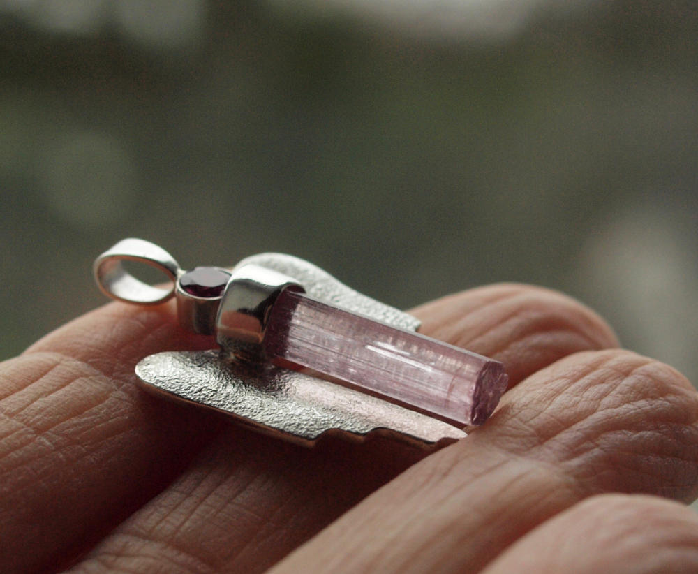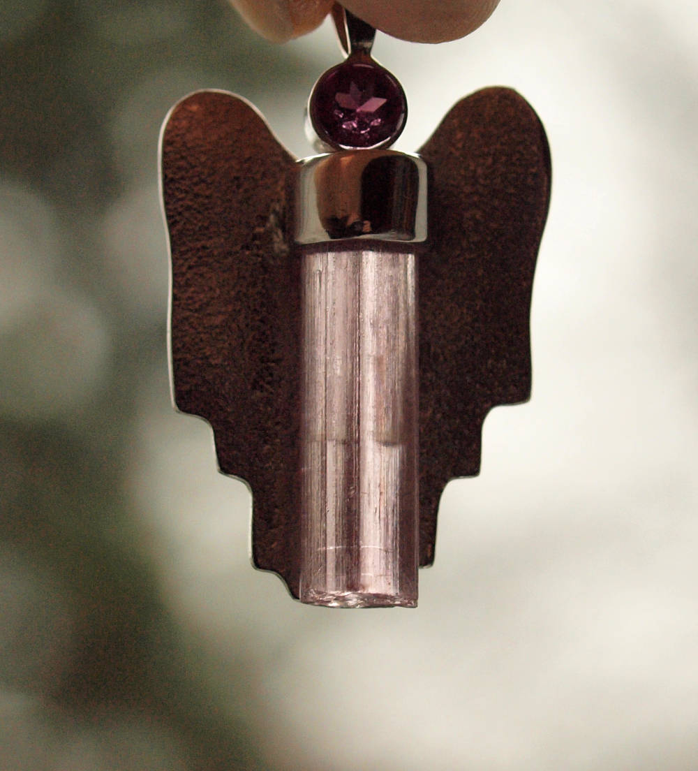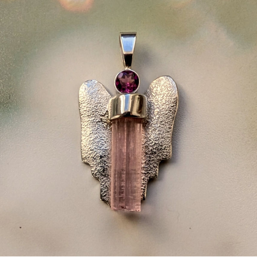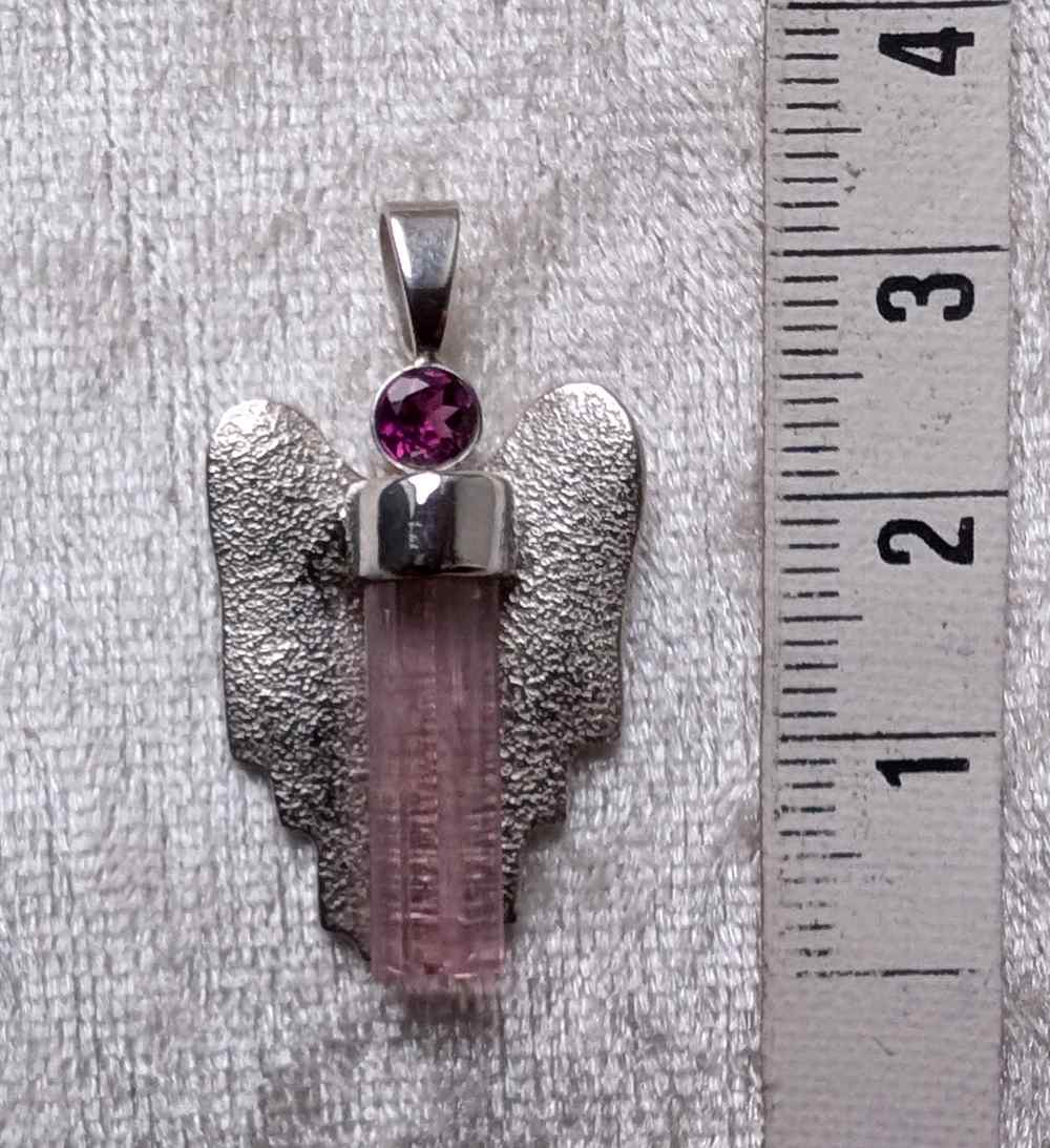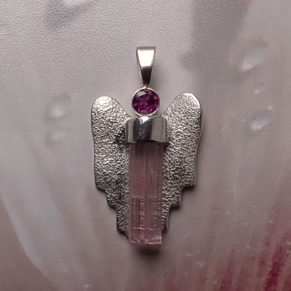 Diesen rosaroten Engel Anhänger mit einem facettierten himbeerroten Granat (Rhodolith) und einem rosa Turmalin (Rubellit) Kristall habe ich in Silber gefasst und mit Silberflügeln versehen.