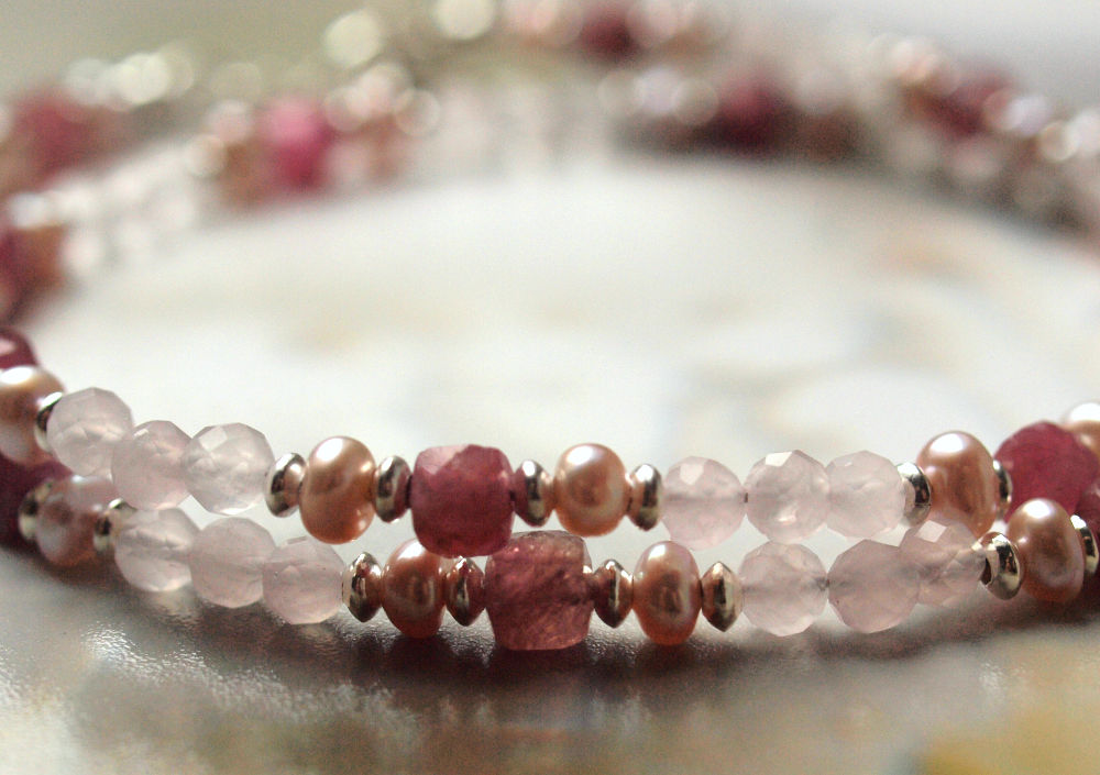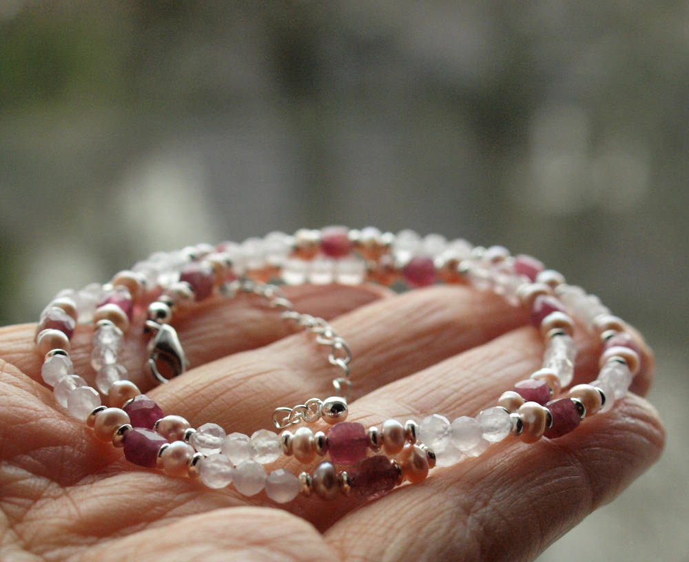Die zarte Kette aus rosa Turmalin (Rubellit), rosa Perlen und Rosenquarz öffnet dein Herz für die Liebe, für dich selbst und für alle Wesen.