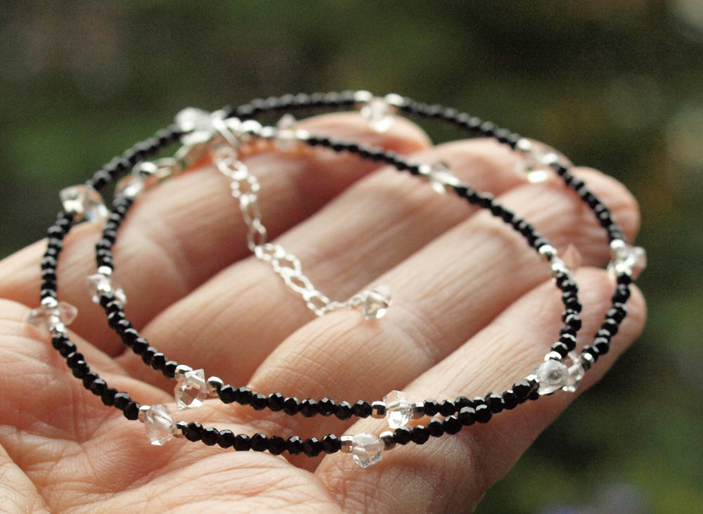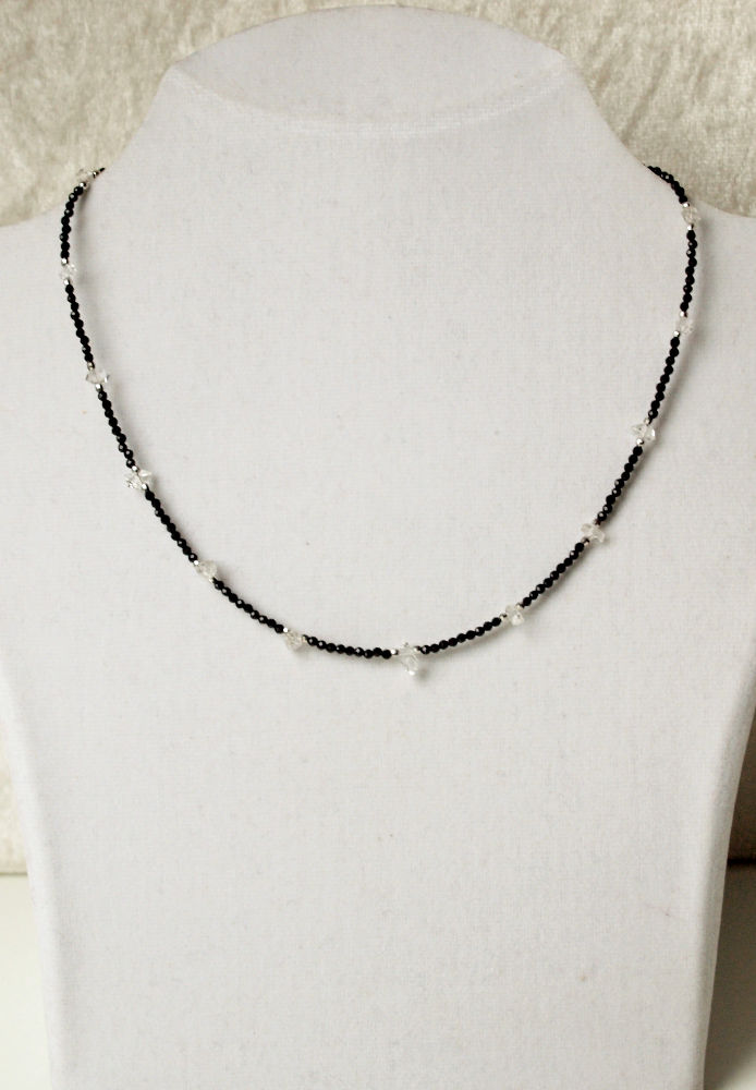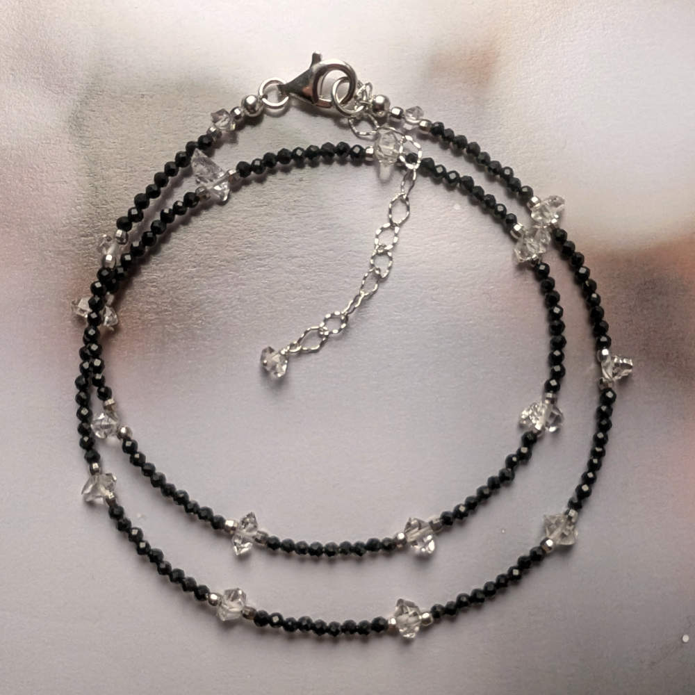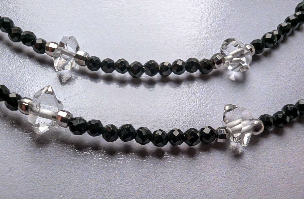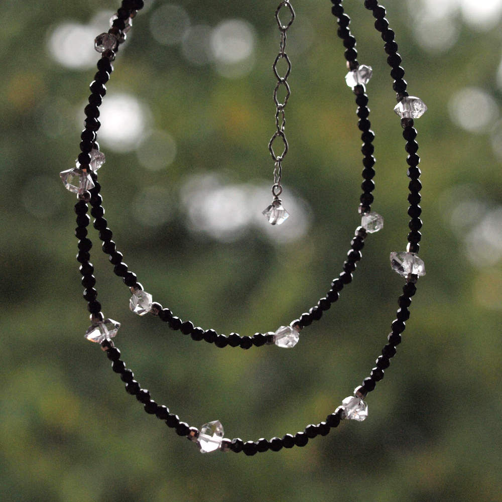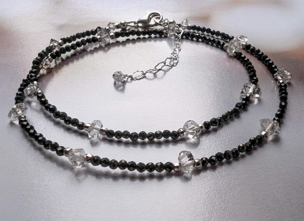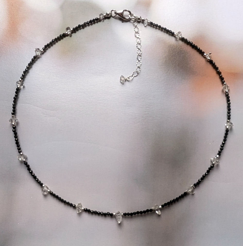 Schwarze Kette aus glitzernden facettierten Schörl Kugeln, kombiniert mit kleinen Herkimer Diamanten und einem Silber Karabiner Verschluss plus Verlängerungskettchen.