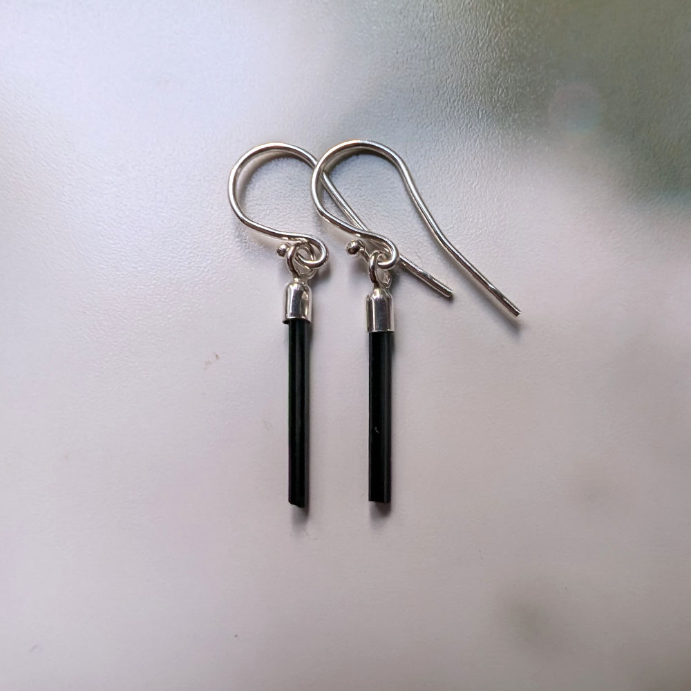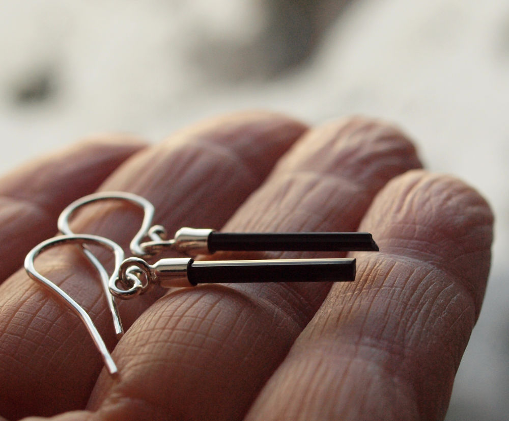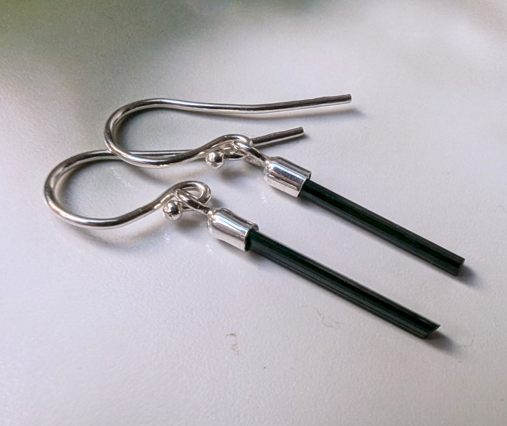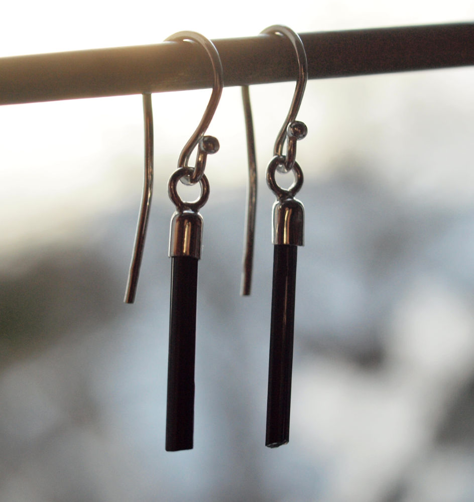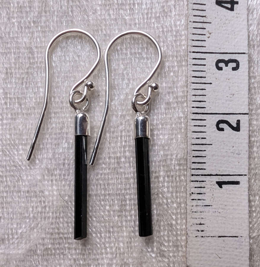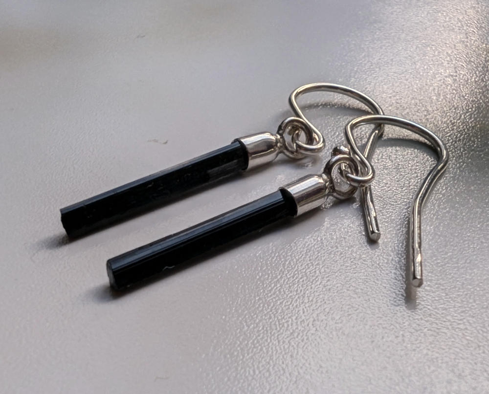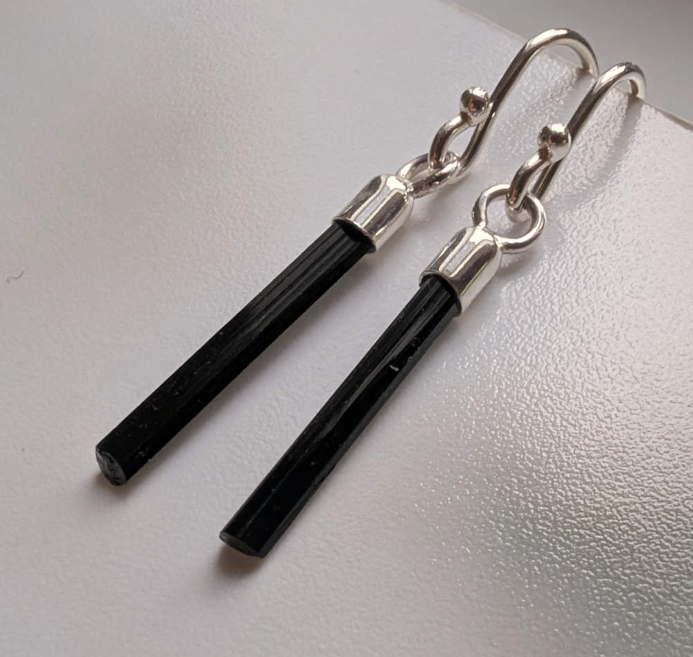Zarte Schörl Kristallstäbe an Silberfassungen und Silberohrhaken.