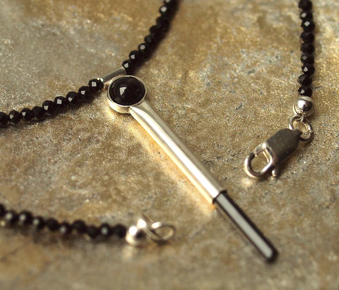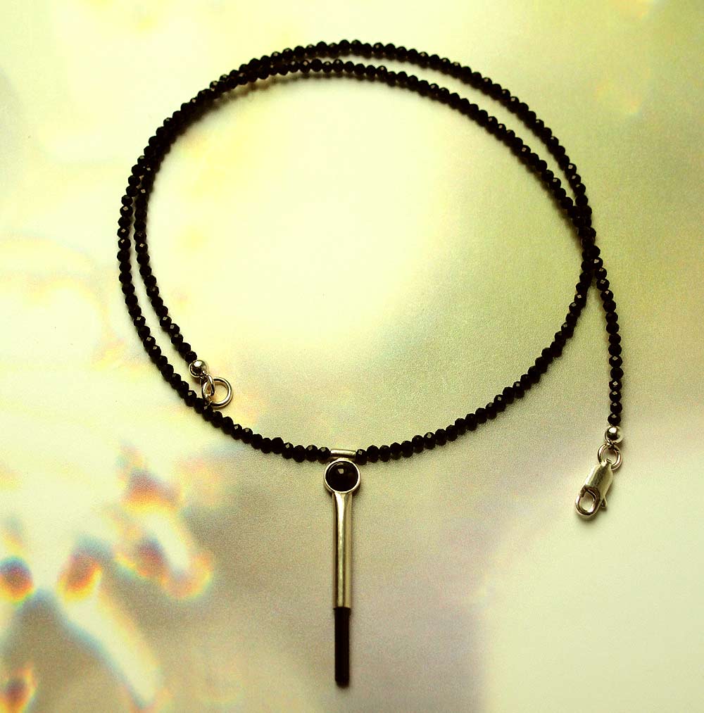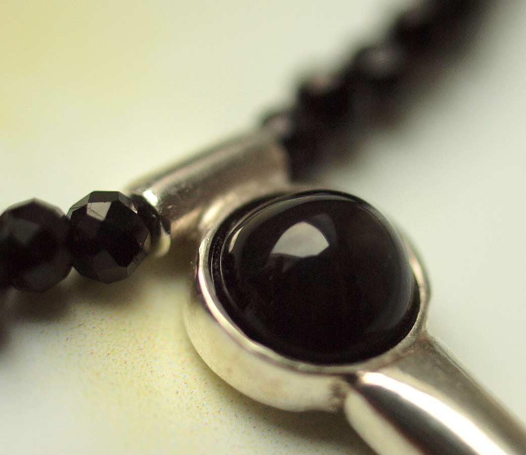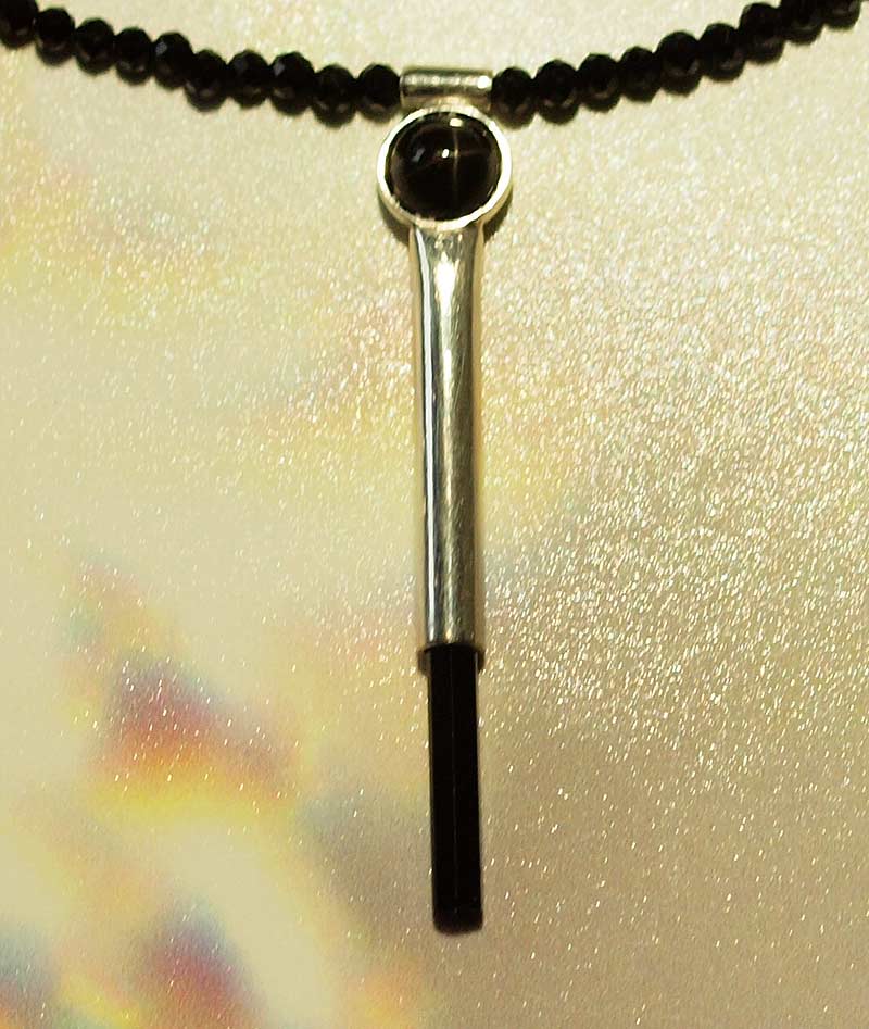 Schwarze Kette aus facettierten Schörl Kugeln mit einem Anhänger aus einem in Silber gefassten Sterndiopsid und einem Schörl Kristall, mit einem Silber Karabiner Verschluss.