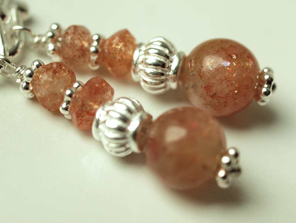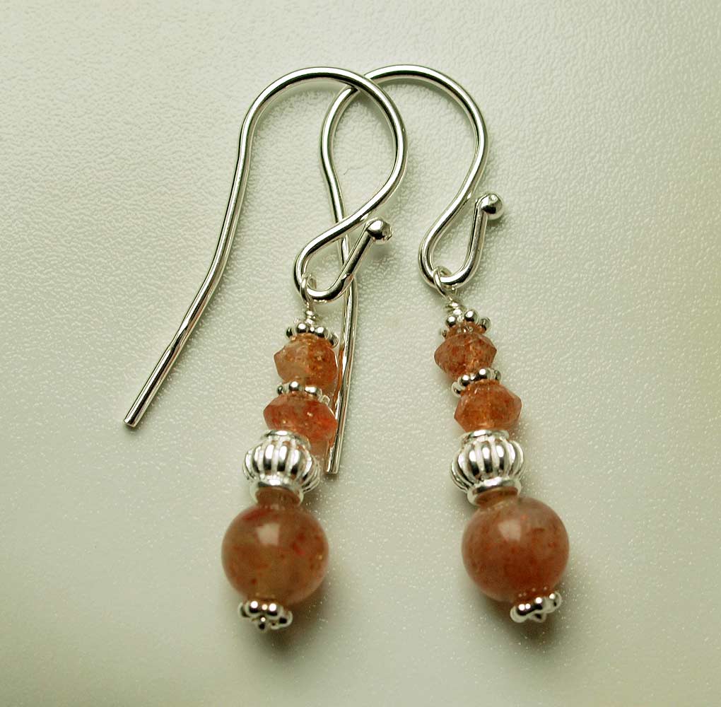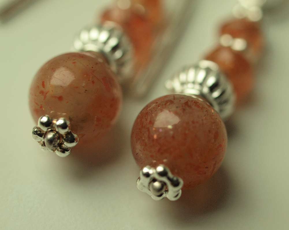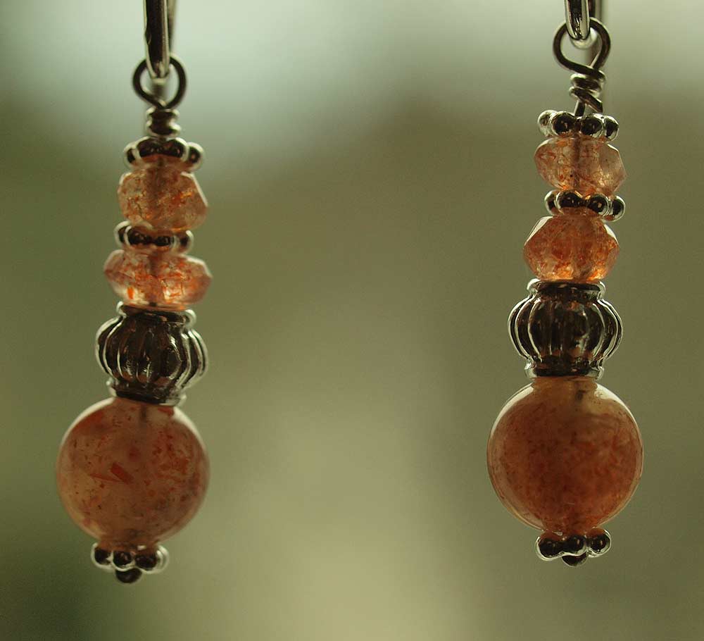 Ohrringe aus Sonnenstein Kugeln und Sonnenstein Rondellen mit Silberzwischenteilen und Silber Ohrhaken.