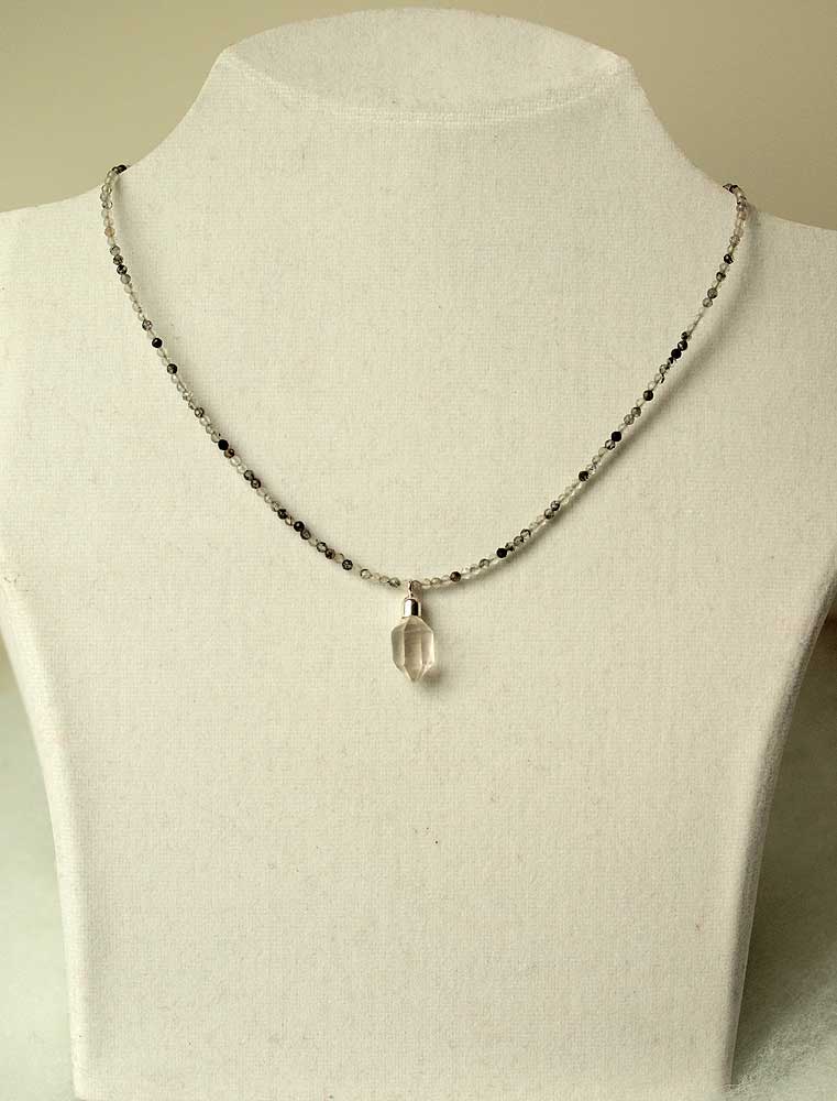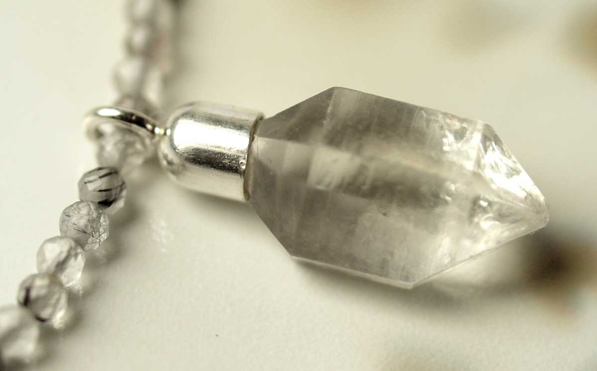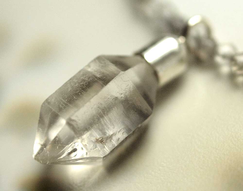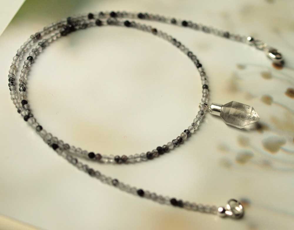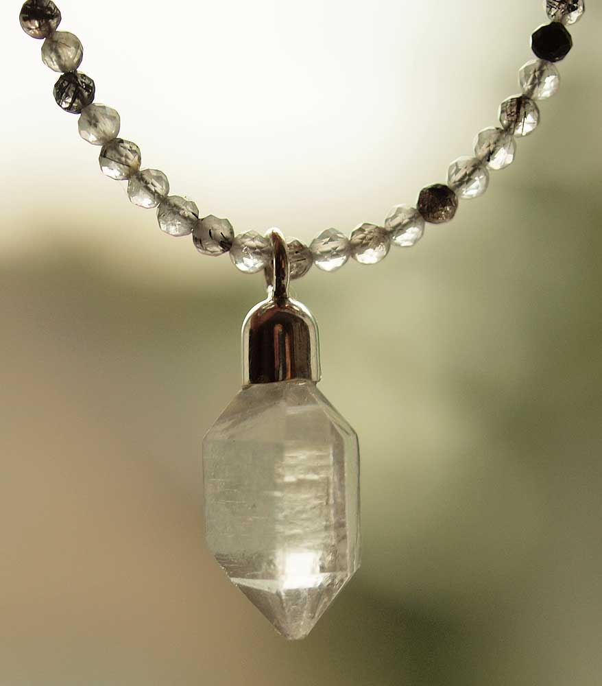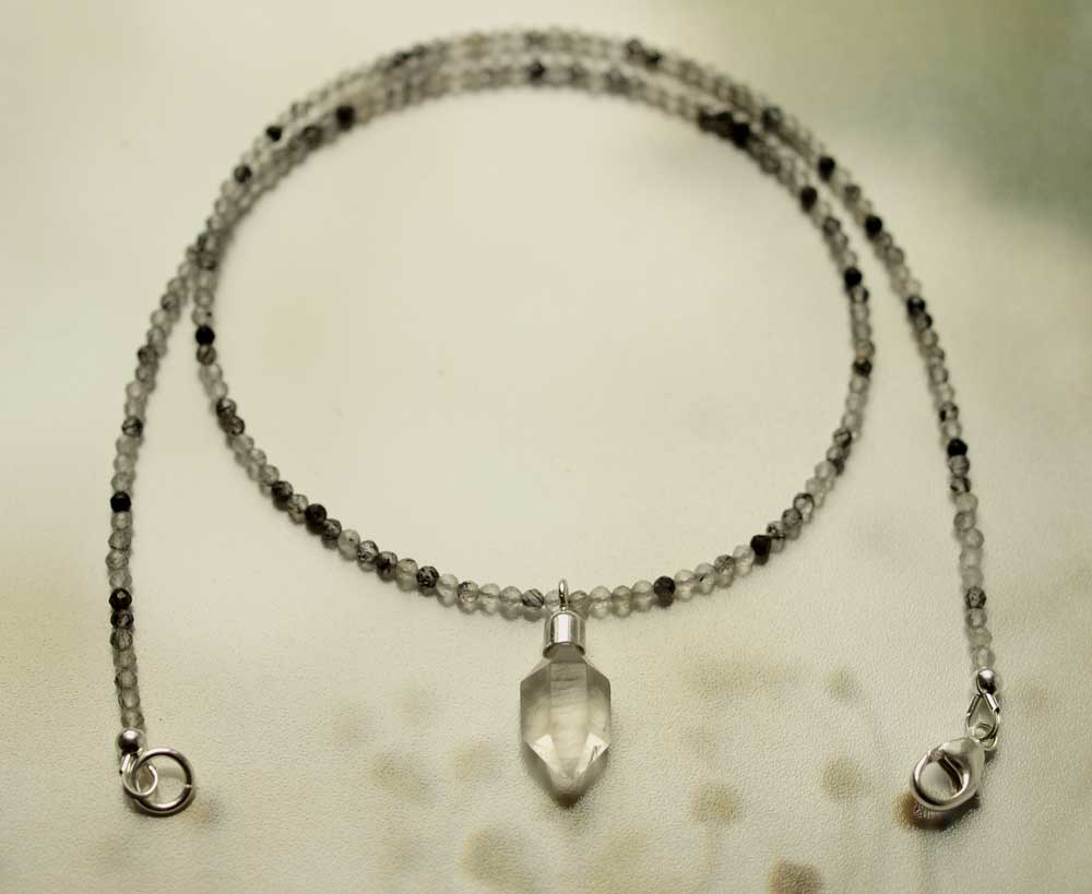 Kette aus sehr kleinen facettierten Turmalinquarz Kugeln mit einem Anhänger aus einem Herkimerdiamanten in Silber und mit einem Silber Karabiner Verschluss.